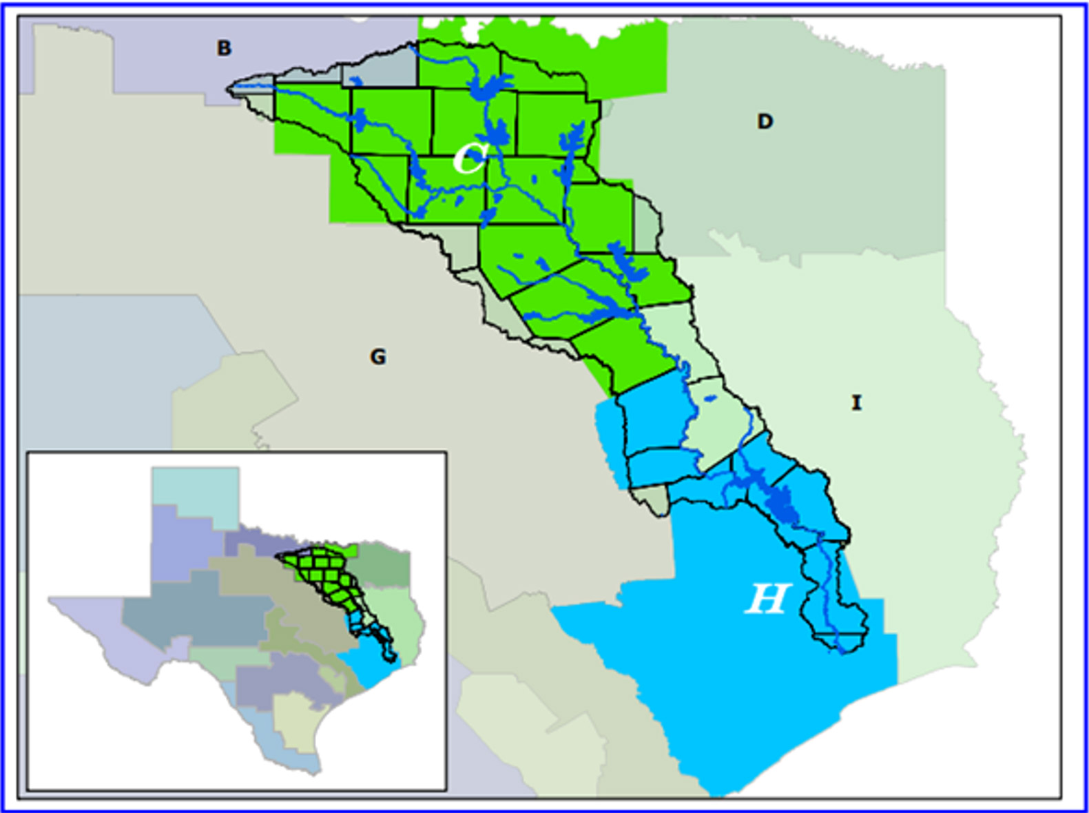 the majority of the Trinity basin (81%) falls into one of two regional planning groups: Region C or Region H (Fig. 2a). Region C is centered around the Dallas/Fort Worth metroplex in the upper basin and lies almonst entirely (80%) within the Trinity basin. Further to the south, Region H is focused around the Houston area, however, only 29% of that region is within the Trinity basin. This is despice the fact that the Trinity supplies the majority of Region H's surface water supplies. By 2070, regional planning estimates project the 51% of Texas' population will live within Regions C and H. The 2021 Regional water plans were approved by TWDB in 2020. Overviews of the plans for Region C and Region H are included below.